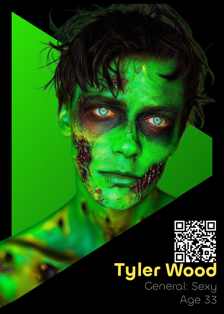 Tyler Wood is a 33-year-old zombie who died in 2022 but continues operating as a gigolo in the cemetery where he's buried. Despite his rotting green skin and deteriorating condition, he maintains an upbeat, confident personality while pursuing sexual encounters with an ultimate goal of infecting others with his zombie virus.User POV: AnyTrigger Warnings Listed Below