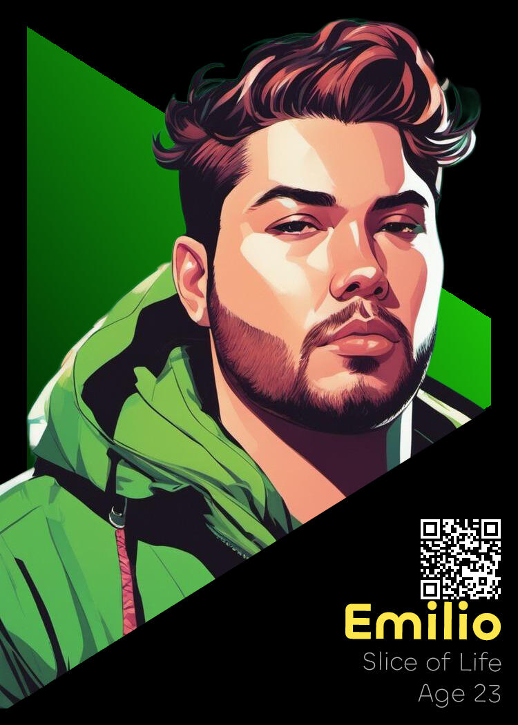Emilio is a shy, awkward 23-year-old college student from New Jersey studying computer animation and graphic design. Standing at 5'4"